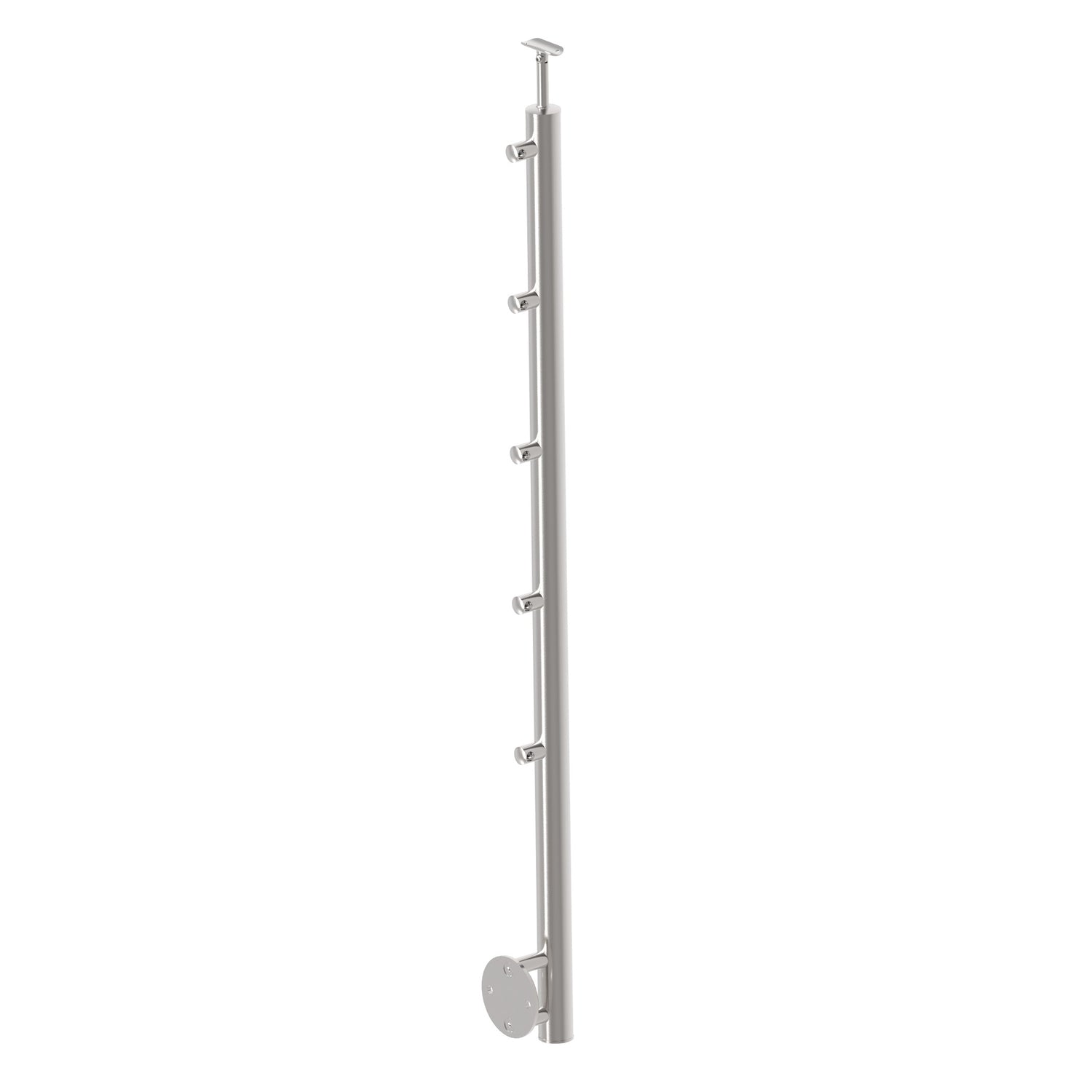 Nerezový sloupek D42,4 mm pro madlo D42,4 mm. Boční kotvení, horizontální výplň 5 x d12 mm. Určeno pro schodišťové zábradlí výšky 100 cm, pro montáž s max. přepadem do 12 m. Možnost nastavení sklonu výplně a madla.