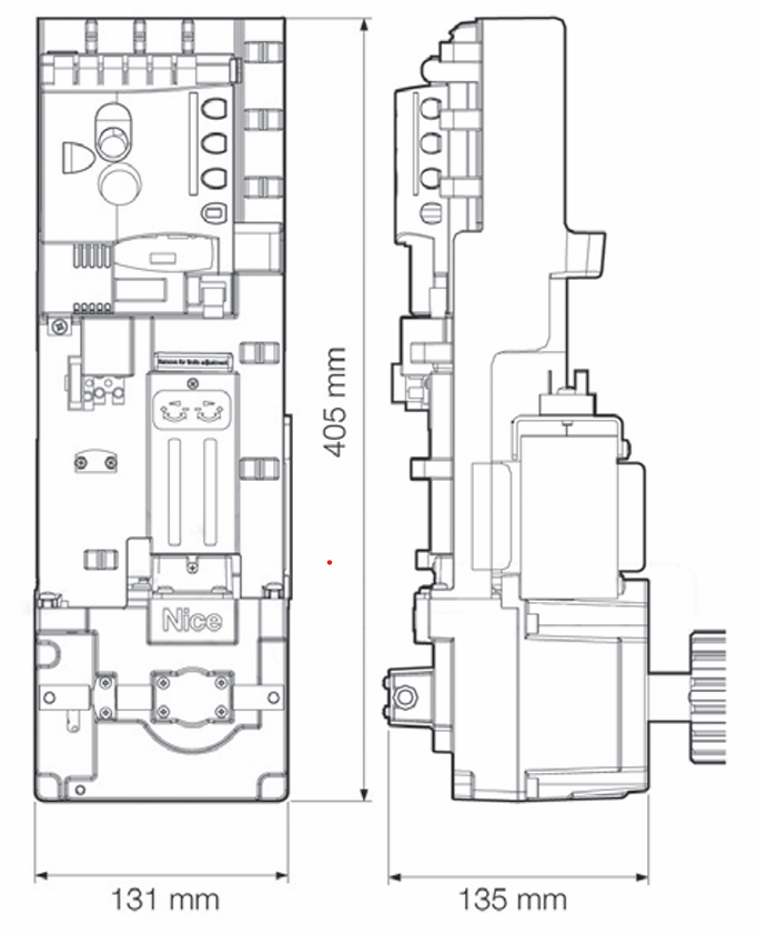 Značka: Nice, Max. délka křídla: 6m, Modul ozubenýho hřebene: mod 4, Hmotnost křídla (doporučená): 200kg, Zpomalení motoru: Spomaluje před koncovými polohami, Napájení motoru: DC 24V, Výkon: 250W, Síla: 400N, Rychlost: 0,34 m/s, Napájení: AC 230V, Řídící jednotka: NKA3, Master/Slave: Ano