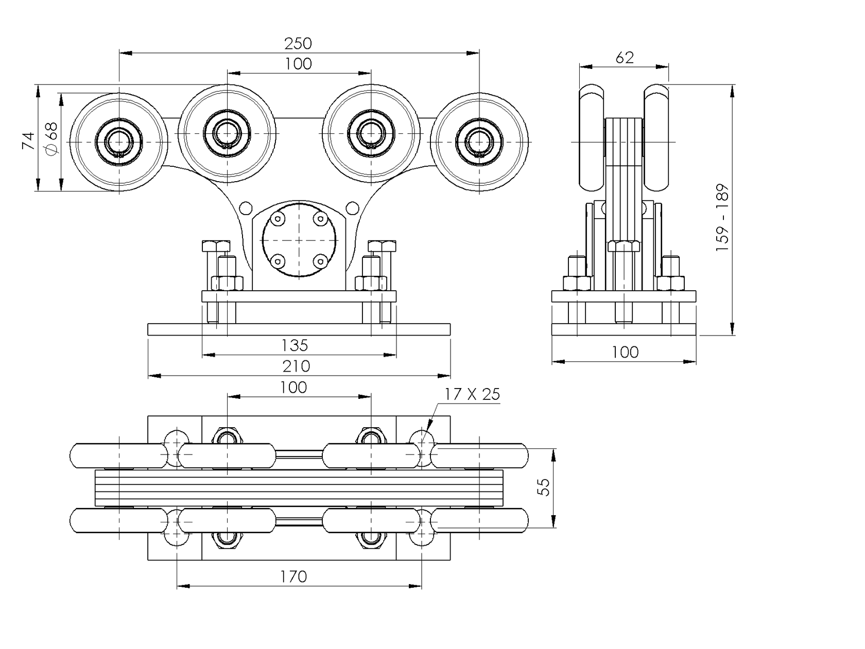 Vozík pro nesené brány Zn+NYLON, profile 90x99mm H/34B-4-90x99-NYLON