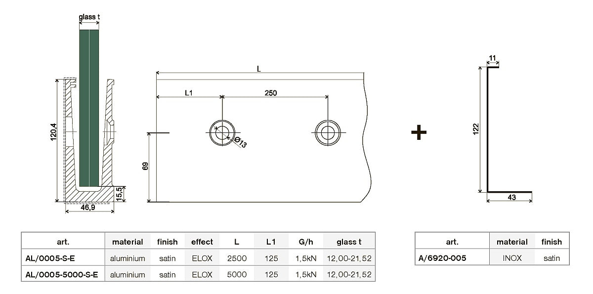 Kotvení boční - sklo AL/ELOX/Satin, L245, 90° OUT AL/0005-D-S-E-90-OUT