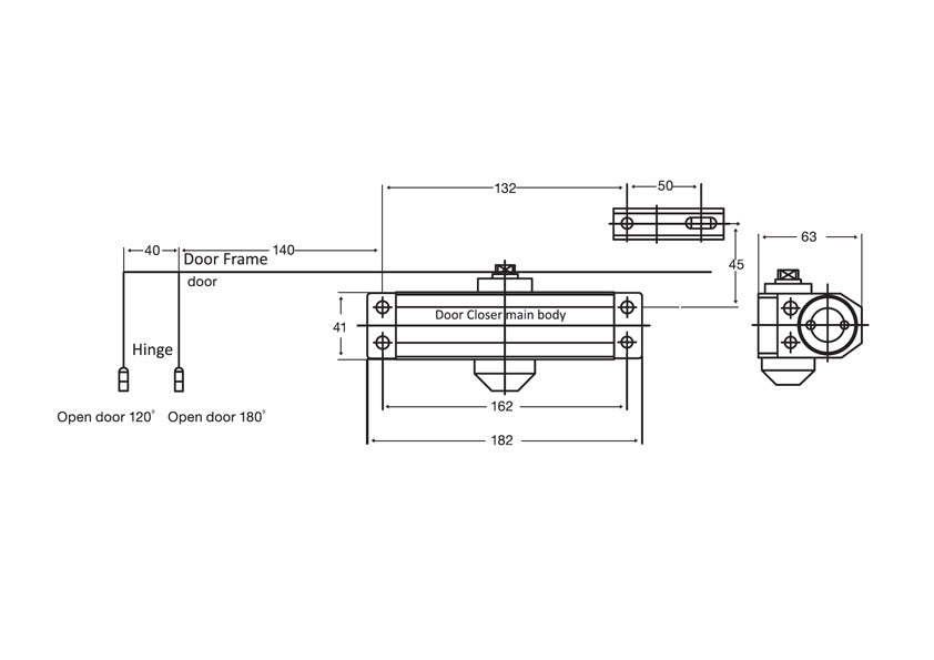 Samozavírač s plynulým nastavením zavírání 180 ° -15 ° a15 ° -0 °, rozměry 182x41x63mm. Maximální šířka dveří 900mm, váha dveří do 60kg.