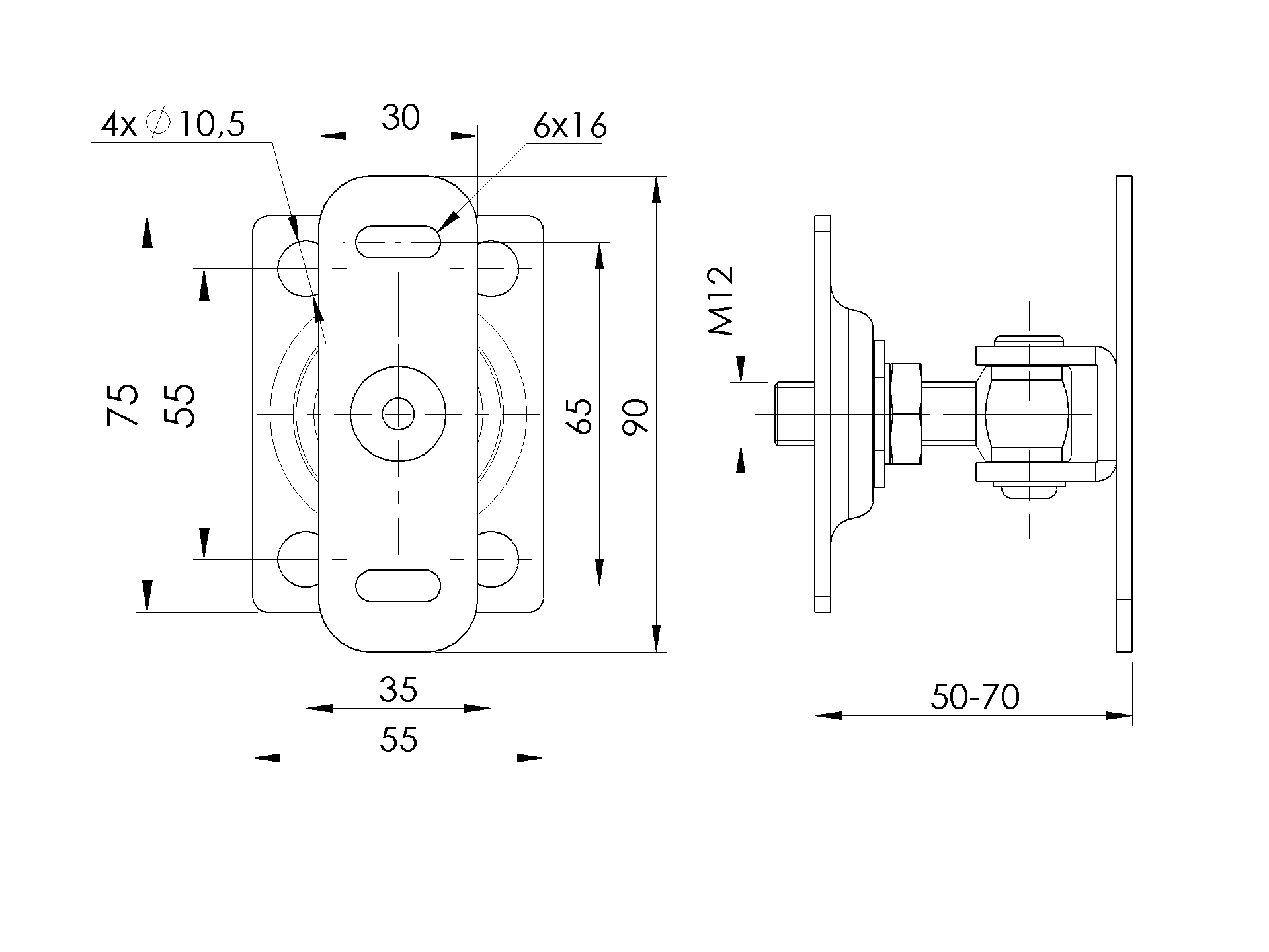 Adjustable hinge with anchoring flange M12, 55x75 D8/53-M12-K