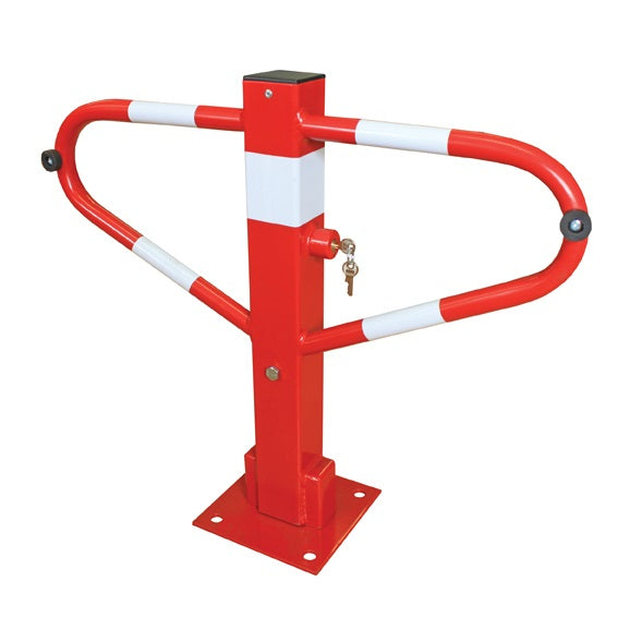 Manual parking space barrier, made of a steel pipe, powder-coated with red reflective paint, additionally marked with white reflective stickers.
