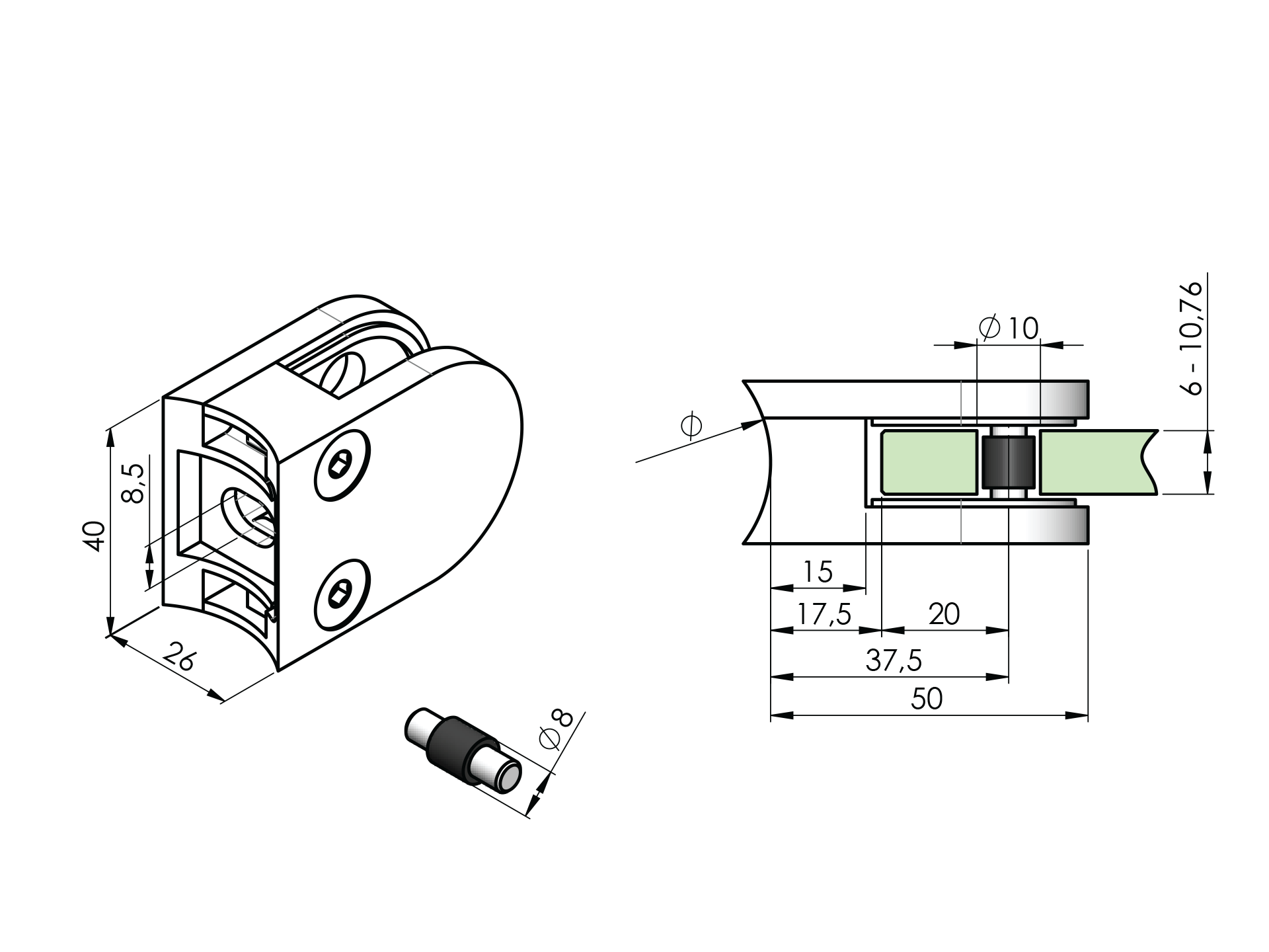 Model 20 Glass holder model 20 is designed for glass thickness 6-10.76 mm, holder dimensions are 50x40 mm. To choose from the materials ZAMAK, stainless steel AISI 304 and AISI316. The surface finish can be natural, brushed or polished.