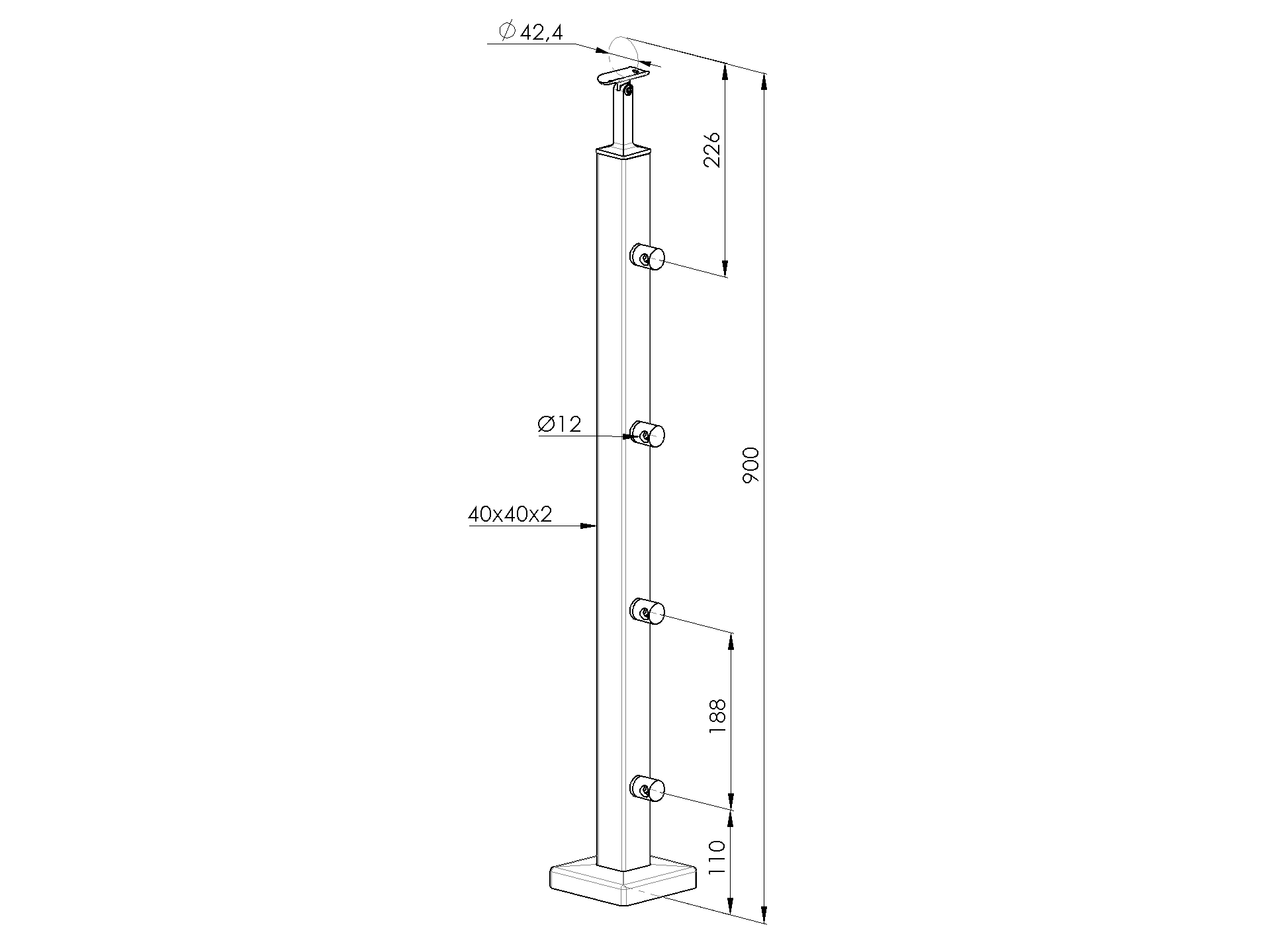 1 pcsMaterialStainless steel AISI 304Surface finishSatinedPost40x40x2Required productsBeech square pole(BEECH)JP 40x40mm, 4xd12mm H900 WBJP-VS90-4D12