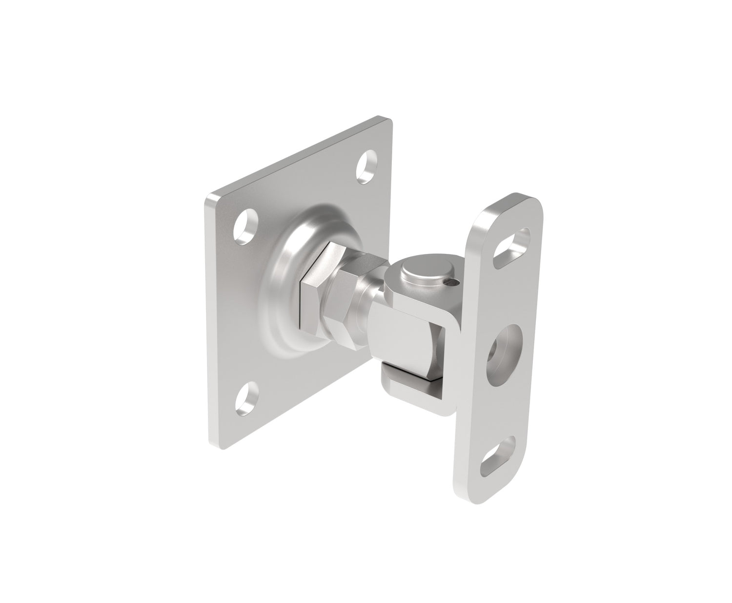 Stainless adjustable hinge with anchoring flange 80x80mm, thread M16. Easy hinge adjustment using a swivel nut.