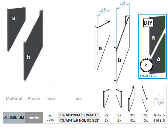 Complete set of slanted distance cover strips for the MOUNT L2 system. With this set, you can assemble a fence panel with a maximum height of 1047.5 mm. The slats are installed with a 5 mm gap, which ensures partial transparency of the fence panel..