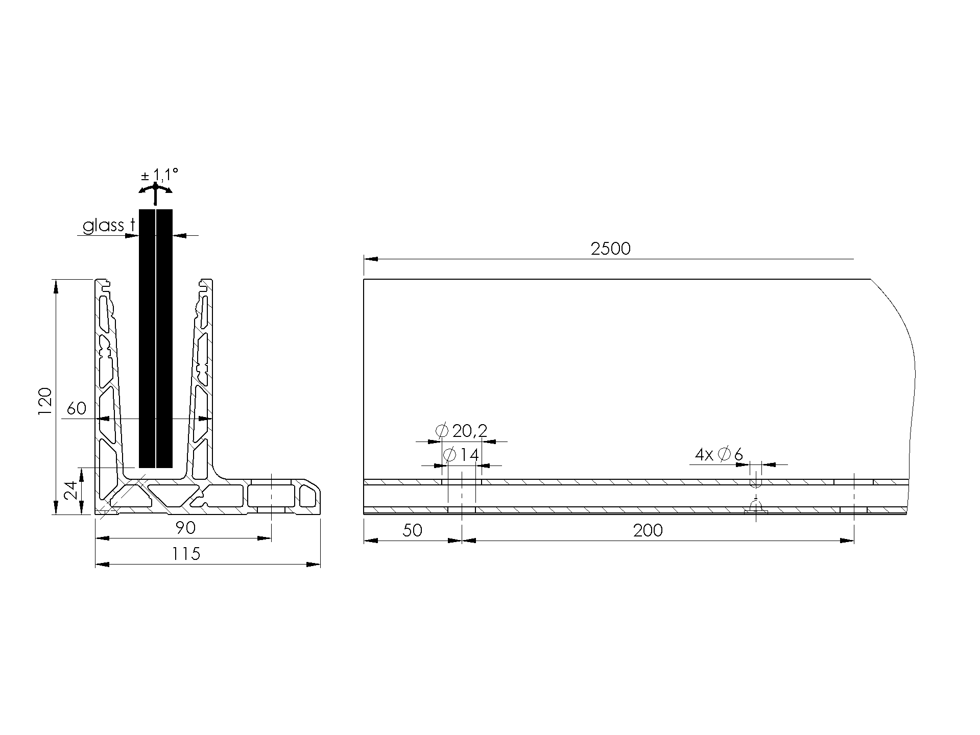 Top mount - glass AL/0006-UNO-2500-S-E