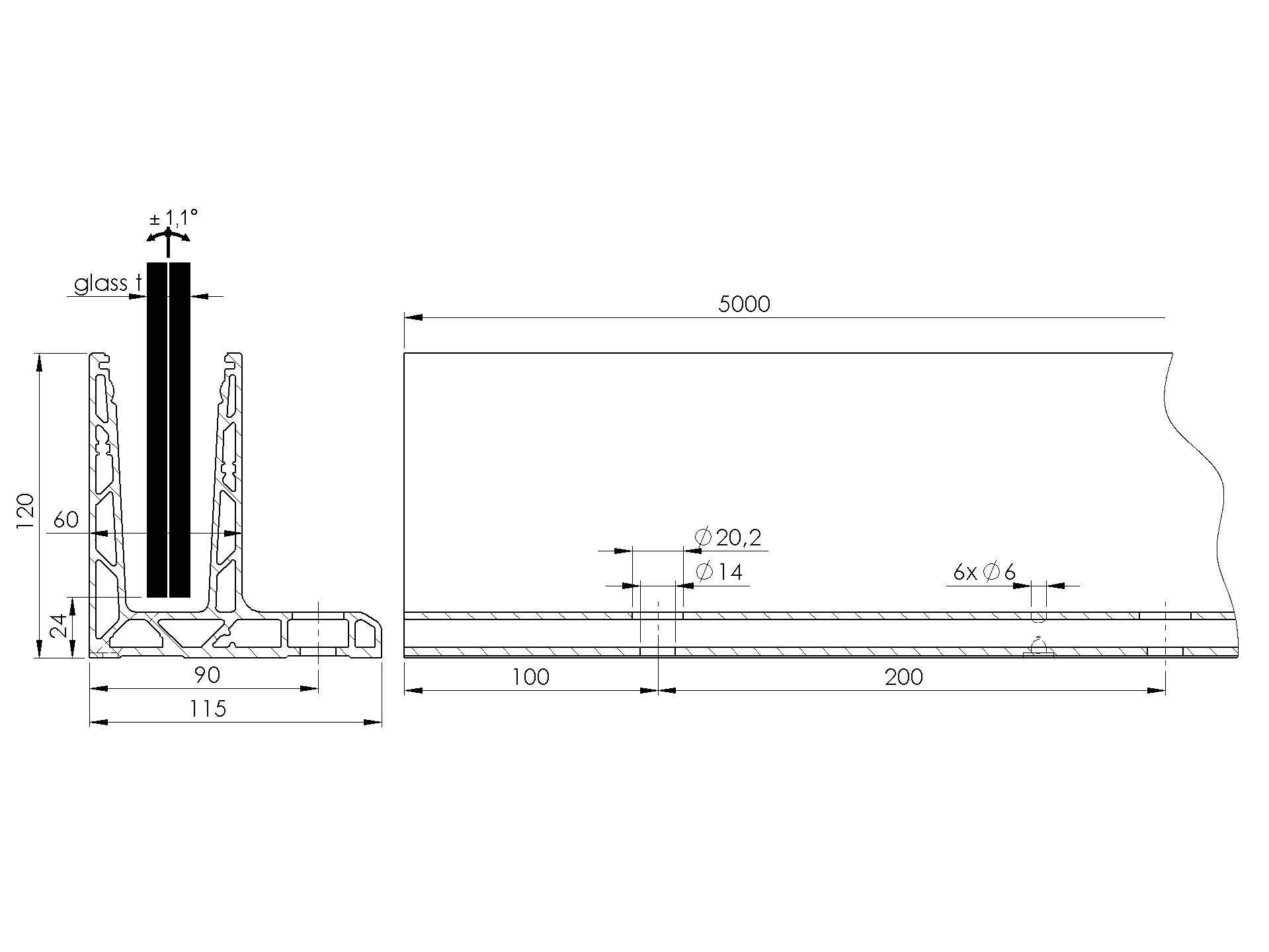 Glass railing, aluminium profile, BR AL/16,76/H100 AL/ZBR100-2500-011-LIGHT